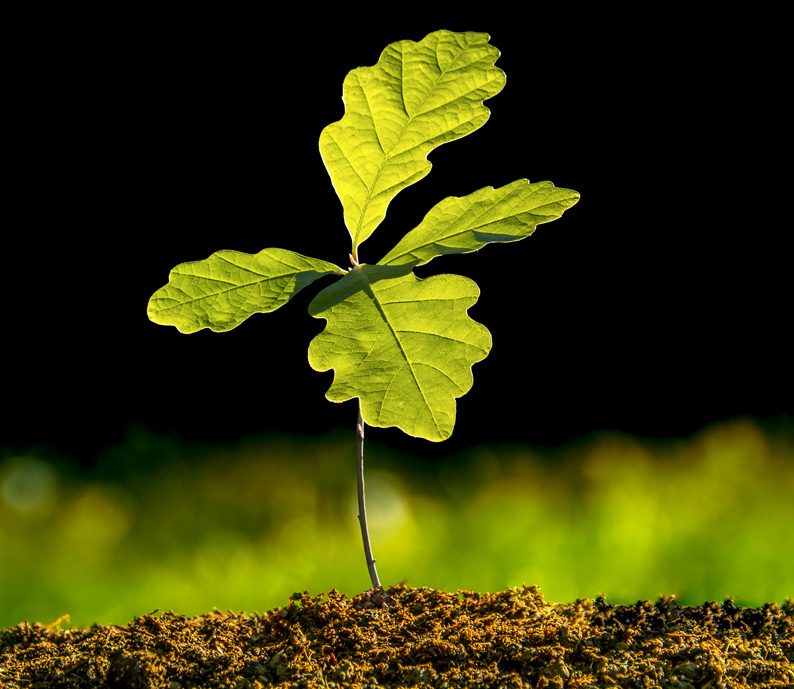 Grâce à ses racines profondes, le semis de chêne puise dans la terre l’eau et les sels minéraux dont il a besoin pour se développer.